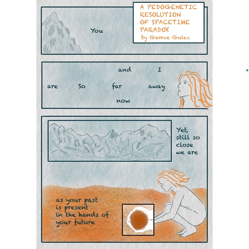 This short silent comic is about a mind that is blocked, clogged, chaotic and in need of care. Here I used soil as a metaphor for the mind to offer solutions by projecting different aspects of soil from soil mechanics, soil microbiology to wildfires into clearing, cleaning, restoring, revitalizing and reconnecting acts.